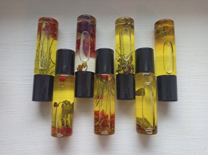 After making my first blends strictly based on fragrance, I thought it would be amazing to combine the use of essential oils medicinally and the idea of wearing a fragrance daily. The idea of choosing a perfume based on your physical, emotional and spiritual needs that day is compelling. I was bewitched by the plant material deftly swirling in the liquid when gently shaken. The whole thing is magical to me.