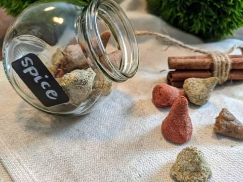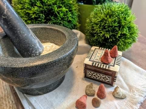 Frankincense (Boswellia sacra): helps with pain relief, antiinflammatory, synergy with myrrh, memory, sacred